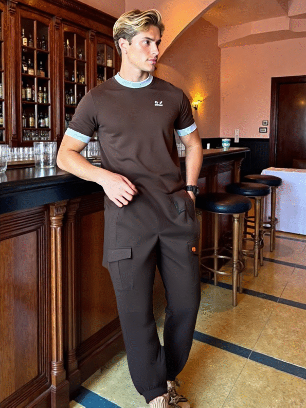 Bold mustard brown cargo trousers with tapered fit, elastic waist, and dual cargo pockets — comfort and standout style for every day.